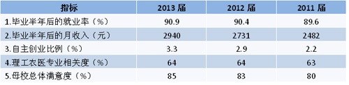 報(bào)告顯示,畢業(yè)生就業(yè)率持續(xù)上升,2013屆畢業(yè)生半年后的就業(yè)率為90.9%,比2012屆上升0.5個(gè)百分點(diǎn)。月收入持續(xù)增長,“跑贏”通貨膨脹,2013屆畢業(yè)生半年后月收入為2940元,比2012屆增長7.7%。自主創(chuàng)業(yè)比例為3.3%,比兩年前的2.2%提高了50%。畢業(yè)生專業(yè)相關(guān)度為64%,與前兩年基本持平。畢業(yè)生對母校的滿意度持續(xù)上升,2013屆的滿意度為85%,比2012屆上升2個(gè)百分點(diǎn)。(見表1)